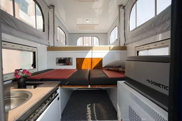 房车配置更是以“性能最优“为原则,该房车车身整体采用全航空铝轻量化车身设计,房车顶部可以随时电动升降,在行驶过程中可以收起顶部,降低风阻系数,提高车身稳定性;在露营生活中,可以把顶部升高,扩展房车生活使用空间,使旅行自由切换在探险和生活的不同模式里。