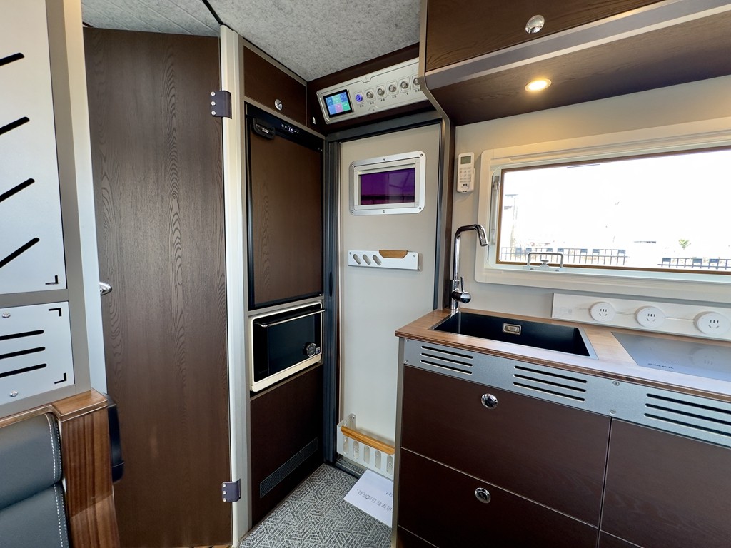 装甲防护箱体,豪华起居暗藏锋芒房车箱体采用铝骨蒙皮轻量化打造,强度与安全性双重拉满,既保证轻量化,又能抵御户外复杂环境的冲击。车内功能分区科学: 睡眠区:后尾可伸缩豪华大床+ 电动升降对坐沙发变床,会客休息一键切换。装甲外壳内藏柔软休憩港湾,让荒野露营也能安享深度睡眠 厨房区:多功能微蒸烤炸一体机、房车电磁炉、房车专用压缩机冰箱76L、一体式橱柜,车内烹煮随心;车外更配备柴油猛火炉灶的移动厨房,不论是阴雨天的室内火锅,还是露营时的大餐,都能一一实现! 卫浴间:独立淋浴间配备美国Maxxfan换气扇、房车专用马桶、汉斯格雅一体式恒温淋浴花洒。 贴心细节:房车专用地板、带防蚊帘的窗户,提升生活品质。